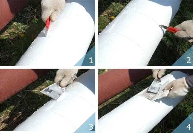 3. Una forma bastante sencilla y eficaz de resolver el problema: envolver las tuberías con masilla epóxica. La metodología del trabajo es la siguiente. La tubería se limpia previamente de restos de óxido con papel de lija y luego se desengrasa con limpiador de acetona. A continuación, se aplica la primera capa de masilla y se coloca una venda de tela en la tubería que proporciona la impregnación de resina de las tuberías de suministro de agua fría. Una vez curado la resina, se aplica una segunda capa de masilla. Este método es bastante eficaz y económico. Sin embargo, estropea el aspecto de todo el cuarto de baño, a la vista de lo que no es demasiado popular hoy en día.